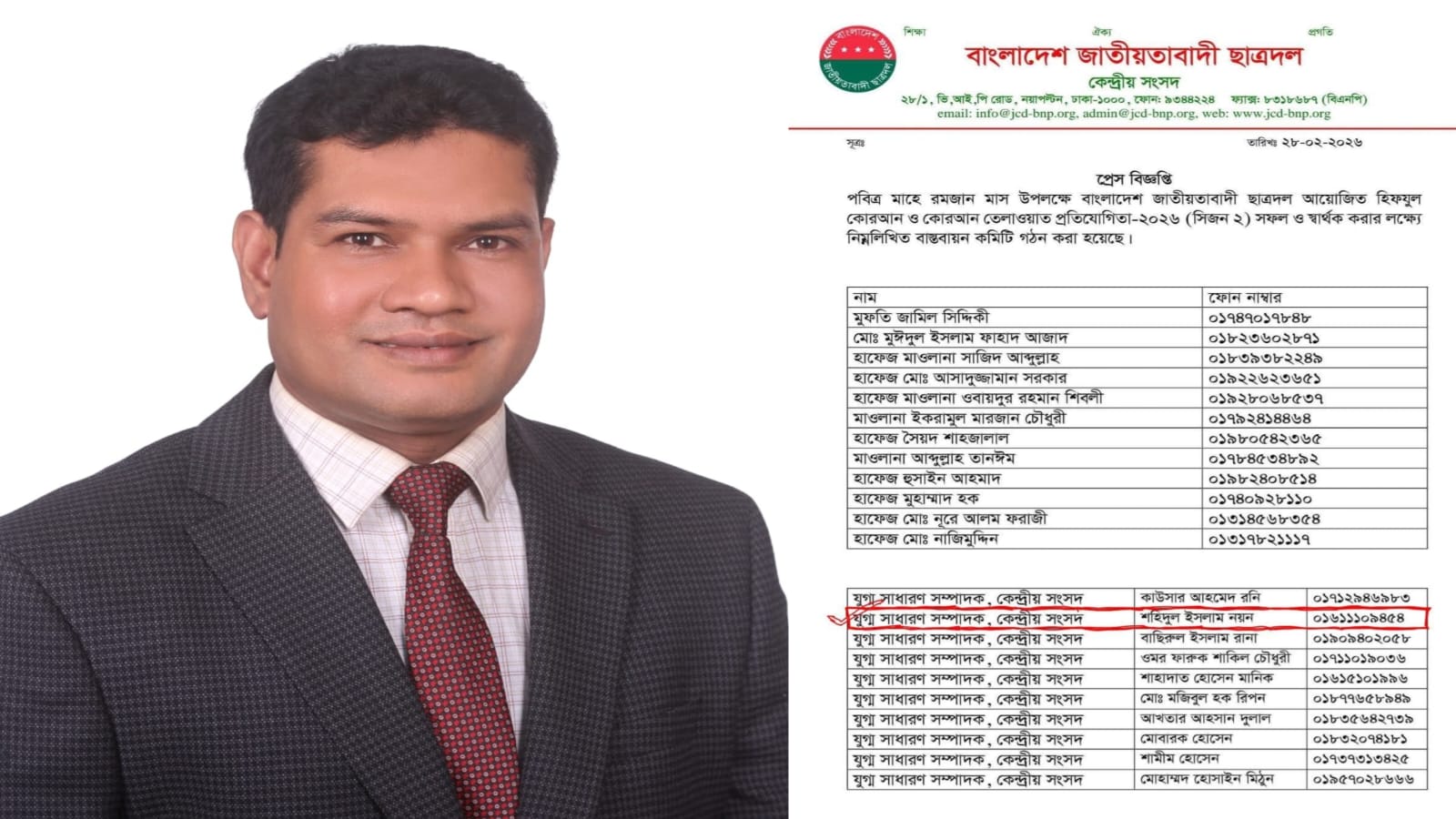 ছাত্রদল আয়োজিত হিফজুল কুরআন প্রতিযোগিতা বাস্তবায়ন কমিটির সদস্য হলেন বরগুনার কৃতি সন্তান ছাত্রদল কেন্দ্রীয় সংসদের যুগ্ম-সাধারন সম্পাদক মোঃ শহিদুল ইসলাম নয়ন l
