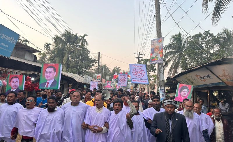 বাউফলে বিএনপি প্রার্থীর মনোনয়ন বাতিলের দাবিতে কাফনের কাপড় পরে বিক্ষোভ